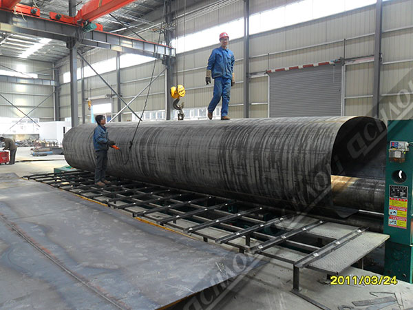 掛車用卷板機增加托輥及上輥撓曲補償可使筒件取得較好的直線度。可增加外托料架及內升料架使操作更便利,更少人工。可配合前后道工序作生產線優化使用。